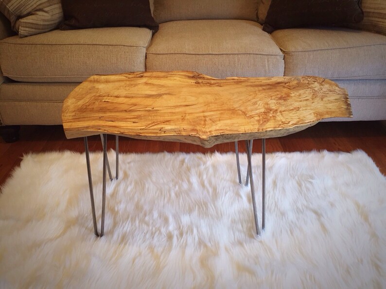 Handmade Live Edge Maple Coffee Table With Hairpin Legs by ... from images.custommade.com The wood slice and hairpin legs that we used for this project were all from amazon! Our style is more coastal than rustic, but i really think that a beautiful wood slab piece can go. Table is 90 cm x 15 cm thick and is based on three hairpin legs in cooper color. Alterre furniture round hairpin live edge end table in natural. Hairpin leg diy live edge wood coffee table last week, i finally made myself a furniture dolly so i can get crackin' on what i love most, furniture makeovers! This coffee table is not only a gorgeous piece of the woodwork but is carefully sanded on the edges to preserve its natural beauty. With several heights to choose from and multiple tabletop size. If he was building a retro live edge table;
